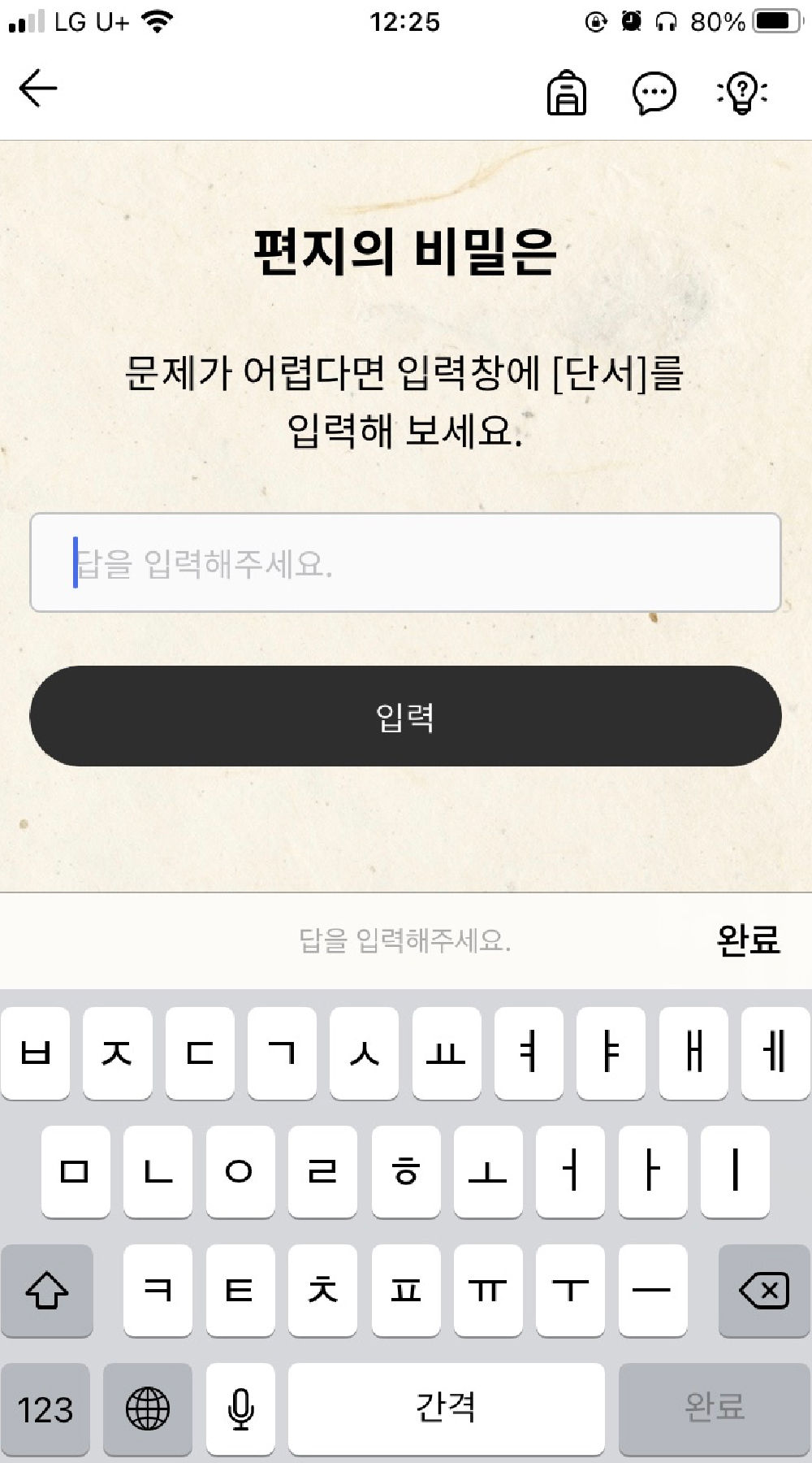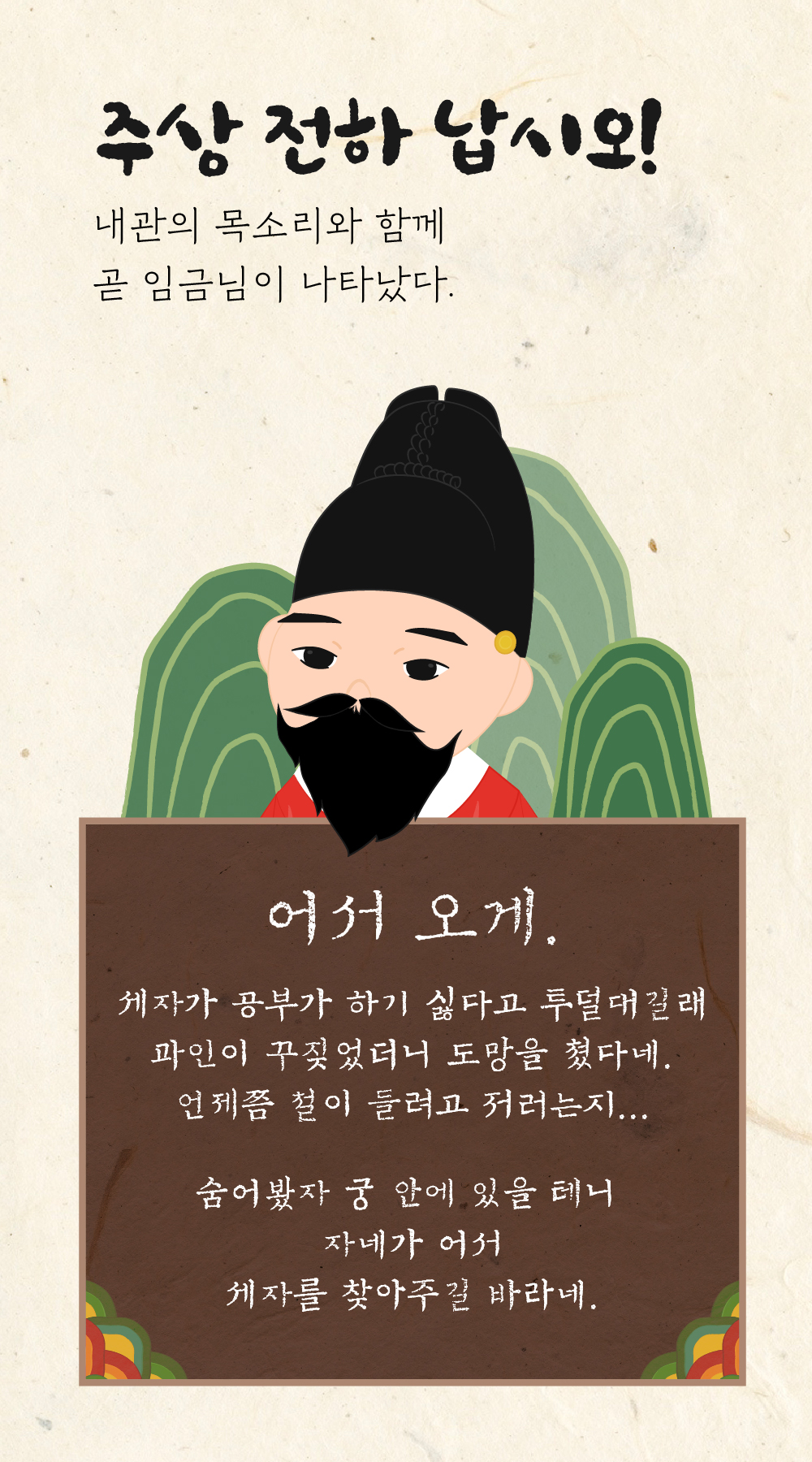 1. 리얼월드 앱이 설치된 디지털 기기 (스마트폰, 태블릿 PC 등) * 시작 전 반드시 경복궁 안내실 앞에 비치된 경복궁 안내지도를 챙겨가세요. ▶ 경복궁 입장료(1,500원~3,000원)는 포함되어 있지 않습니다. 경복궁 관람요금 및 관람시간, 한복 무료 관람 가이드 라인은 변동될 수 있으니 문화재청 경복궁관리소 홈페이지 (http : //www.royalpalace.go.kr ) 를 참고해 주세요. ▶ [세자저하가 사라졌다]는 경복궁 상주 직원과 무관한 리얼월드 콘텐츠 입니다. 따라서 경복궁 직원에게 미션 풀이에 대해 문의하여도 도움을 받을 수 없습니다. <세자저하가 사라졌다!>의 답안 및 해설 페이지입니다. https : //rwd.to/prince 비밀번호는 <의문의 서찰> 미션에 등장하는 \\\\\\'ㄱㅇㅅㄹ\\\\\\'에 해당하는 4자리 숫자입니다. |